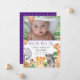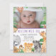 Share the good news with family, friends, and neighbours about the joy of your new baby when you send out these adorable jungle safari birth announcements. These gender neutral birth announcements feature a sweet array of African safari animals: a giraffe, cheetah, elephant, zebra, lion, and ostrich. The trendy text says "WELCOME WILD ONE". Personalise it with the full name of your baby, the birth date, the birth weight, and the height. Add a photo of your darling newborn at the top of the postcard. So cute for announcing baby's arrival.