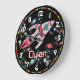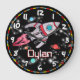 Colourful kids graphic wall clock designed by exclusively by Sarah Trett. Customise with the name of your choice, this example reads Dylan. Would be a great personalised addition to your child's space themed bedroom.