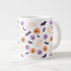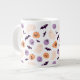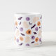This design features a playful and colourful Halloween pattern with a minimalist design. The pattern includes simple, rounded shapes of jack-o'-lanterns, ghosts, skulls, and bats, all scattered across a white background. The colour palette is soft yet vibrant, with pumpkins in shades of orange, ghosts in pale peach, skulls in lavender, and bats in deep purple. Each element has a cute and friendly expression, making the pattern fun and lighthearted, perfect for Halloween decorations or kids' party themes. The overall design is cheerful and festive, capturing the whimsical side of Halloween.
