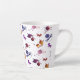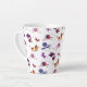 White latte mug with all around pattern of knitting needles, balls of yarn and cats pulling yarn. Gradient colours are maroon, blue, pink and golden brown. Choose either the small or tall latte mugs.