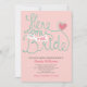 Customise this lovely fun and modern whimsical Bridal Shower Invitation with hand lettering mint green text Here Comes the Bride on a blush pink background.