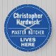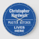 Fun Commemorative Style Wall Plaque Gift in the form of a Wall Clock for a Master Butcher. Blue and white plaque. Edit the design to change the wording to suit the gift recipient.