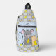 A fun sling bag featuring a grey mouse snacking on some delicious Swiss cheese . Personalise it with your initial .