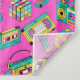 Retro design in the 1980s and 1990s theme, with bright and colourful vintage items such as cassette player, Rubik's cube, sweets, scrunchies, etc. in hot pink, turquoise, and yellow colours.