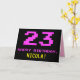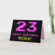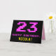 The front of this fun, geeky, and nerdy birthday themed greeting card design features a large pink number "23", along with the message "HAPPY BIRTHDAY," in pink, and a bold yellow personalised recipient name. The text has an appearance inspired by that of retro 8-bit style video game and computer game graphics from the 1970s and 1980s, and the background is coloured black. The inside features a custom birthday greeting message, or could perhaps be cleared and left blank if a message is to be written by hand instead. A silly customisable birthday card like this might be a fun way to acknowledge somebody’s twenty third birthday. [~Z0000478]