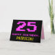 The front of this fun, nerdy, and geeky birthday-themed greeting card design features a large number "25" and the message "HAPPY BIRTHDAY," coloured pink, along with a bold yellow custom recipient name. The text has a look inspired by that of classic 8-bit style video/computer game graphics from the 1970s and 1980s, and the background is coloured black. The inside features a customisable birthday greeting message, or could perhaps be cleared and left blank if a message is to be written by hand instead. A silly personalised birthday card like this might be a fun way to acknowledge somebody’s twenty fifth birthday. [~Z0000478]