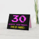 The front of this fun, nerdy, and geeky birthday greeting card design features a large pink number "30", along with the message "HAPPY BIRTHDAY," in pink, and a bold yellow personalised recipient name. The text features a look inspired by that of vintage 8-bit style computer/video game graphics from the 1970s and 1980s, and the background is coloured black. The inside has an editable birthday greeting message, or could perhaps be cleared and left blank if a message is to be written by hand instead. A silly personalised birthday card like this might be a fun way to acknowledge somebody’s thirtieth birthday. [~Z0000478]