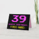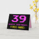 The front of this fun, nerdy, and geeky birthday greeting card design features a large number "39" and the message "HAPPY BIRTHDAY," coloured pink, along with a bold yellow custom recipient name. The text features a look inspired by that of vintage 8-bit style computer game and video game graphics from the 1970s and 1980s, and the background is coloured black. The inside has a customised birthday greeting message, or could perhaps be cleared and left blank if a message is to be written by hand instead. A silly customisable birthday card like this might be a fun way of acknowledging somebody’s thirty ninth birthday. [~Z0000478]