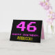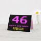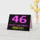 The front of this fun, nerdy, and geeky birthday greeting card design features a large pink number "46", along with the message "HAPPY BIRTHDAY," in pink, and a bold yellow personalized recipient name. The text features a look inspired by that of vintage 8-bit style computer/video game graphics from the 1970s and 1980s, and the background is colored black. The inside has a custom birthday greeting message, or could perhaps be cleared and left blank if a message is to be written by hand instead. A silly customizable birthday card like this might be a fun way to send a message in celebration of somebody’s forty-sixth birthday. [~Z0000478]