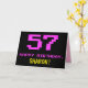The front of this fun, nerdy, and geeky birthday-themed greeting card design features a large number "57" and the message "HAPPY BIRTHDAY," coloured pink, along with a bold yellow custom recipient name. The text features a look inspired by that of vintage 8-bit style computer/video game graphics from the 1970s and 1980s, and the background is coloured black. The inside features an editable birthday greeting message, or could perhaps be cleared and left blank if a message is to be written by hand instead. A silly birthday card like this might be a fun way to send birthday wishes to a woman or somebody else who is celebrating their fifty seventh birthday. [~Z0000478]