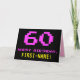The front of this fun, geeky, and nerdy birthday greeting card design features a large pink number "60", along with the message "HAPPY BIRTHDAY," in pink, and a bold yellow editable recipient name. The text has an appearance inspired by that of classic 8-bit style video game and computer game graphics from the 1970s and 1980s, and the background is coloured black. The inside features a customised birthday greeting message, or could perhaps be cleared and left blank if a message is to be written by hand instead. A silly personalised birthday card like this might be a fun way to send a message celebrating somebody’s sixtieth birthday. [~Z0000478]