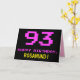 The front of this fun, nerdy, and geeky birthday-themed greeting card design features a large number "93" and the message "HAPPY BIRTHDAY," coloured pink, along with a bold yellow customisable recipient name. The text has a look inspired by that of classic 8-bit style video game and computer game graphics from the 1970s and 1980s, and the background is coloured black. The inside features an editable birthday greeting message, or could perhaps be cleared and left blank if a message is to be written by hand instead. A silly customisable birthday card like this might be a fun way to celebrate somebody’s ninety third birthday. [~Z0000478]