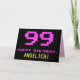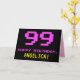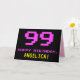 The front of this fun, nerdy, and geeky birthday themed greeting card design features a large number "99" and the message "HAPPY BIRTHDAY," coloured pink, along with a bold yellow custom recipient name. The text has a look inspired by that of classic 8-bit style computer game and video game graphics from the 1970s and 1980s, and the background is coloured black. The inside features a customisable birthday greeting message, or could perhaps be cleared and left blank if a message is to be written by hand instead. A silly personalised birthday card like this might be a fun way to celebrate somebody’s ninety ninth birthday. [~Z0000478]