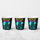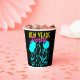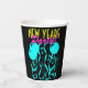 Fun New Years Eve party custom paper cups with neon colours and black background template design. Festive celebration illustration with champagne flutes, balloons, music notes and confetti. Customisable design. Retro neon pink yellow and turquoise letters.