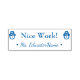 This positive rubber stamp design features the inspiring message "Nice Work!" and a personalised tutor name. It also features decorative snowman icons. It could be used by a school teacher, educator, or tutor when grading student work, to acknowledge that a student has done an exceptional job.