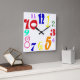 A square clock with funky fun numbers in different colours on a white background. All the numbers are different sizes and fonts, which gives a fun, modern look.