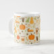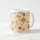 This design showcases a delightful fall-themed pattern filled with cosy autumn elements. The design includes illustrations of pumpkins, slices of pumpkin pie topped with whipped cream, warm fall beverages in to-go cups, and butternut squash. Scattered among these are cinnamon sticks, star anise, sprigs of greenery, autumn leaves, acorns, and small berries, all set against a soft cream background. The pattern exudes a warm and inviting atmosphere, perfect for celebrating the flavours and colours of the autumn season.