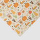 This design showcases a delightful fall-themed pattern filled with cosy autumn elements. The design includes illustrations of pumpkins, slices of pumpkin pie topped with whipped cream, warm fall beverages in to-go cups, and butternut squash. Scattered among these are cinnamon sticks, star anise, sprigs of greenery, autumn leaves, acorns, and small berries, all set against a soft cream background. The pattern exudes a warm and inviting atmosphere, perfect for celebrating the flavours and colours of the autumn season.