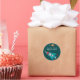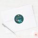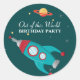 This cute boy's birthday party round sticker has an out of this world space theme! The background has a dark teal colour with lots of yellow, white, and grey stars in the background. There is a retro styled flying spaceship on the bottom with an orange and red planet with rings on the top. Out of this World Birthday Party is written in the middle.