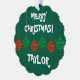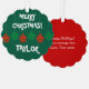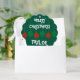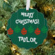 Fun paper Christmas ornament card with envelope. Red and green coloured Merry Christmas lights design. Playful Holiday design with colourful hanging light bulb balls and custom seasons greeting message. Personalise with name of adult or child. Fun decor cards with Xmas decorations. Dark green or custom background colour. Funny typography letters. Includes ribbon to hang in a tree.