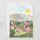This fun and cute kid's birthday invitation card features a joyful picnic scene surrounded by nature, fresh air and sunny skies. We see kids playing, a kite flying, a balloon, a cake, a guitar, a picnic basket and a little bird sitting on a balloon. Ths cute card is sure to delight everyone who recieves it.