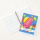 A spiral notebook with a summery theme. Designed with pink popsicle and some red strawberries tumbling around the popsicle along with some yellow paint splashes. Blue background. Personalise with a name in a blue font layered over top a white stripe.