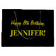 One side of this fun and simple birthday-themed gift bag design features a large number "8" with a dark pink and light pink stripes pattern. The birthday greeting message "Happy 8th Birthday," and a custom name appear on the other side, both in yellow coloured text. The background is coloured black. Gift bags like this might be used when wrapping gifts or presents being given in honour of somebody’s eighth birthday. [~Z0000378]