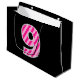 One side of this fun and simple birthday-themed gift bag design has a large number "9" featuring a dark pink and light pink stripes pattern. The other side has the birthday greeting message "Happy 9th Birthday," and an editable name, both in yellow coloured text. The background is coloured black. Gift bags like this might be used when wrapping presents or gifts being given to celebrate somebody’s ninth birthday. [~Z0000378]