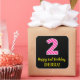 This joyful birthday-themed square sticker design features a large number “2” with a dark pink and light pink stripes pattern, along with the message “Happy 2nd Birthday,”, and an editable name. The background is coloured black. Fun, personalised stickers like this might be given as a birthday present, or used while wrapping presents, or perhaps used as a birthday party decoration when celebrating somebody’s 2nd birthday. [~Z0000578]