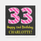 This fun birthday-themed paper napkin design features a large number "33", with a dark pink and light pink stripes pattern. It also features the message "Happy 33rd Birthday,", and a personalised name. The background is coloured black. Fun, editable paper napkins like this might be used at a party being held to celebrate somebody’s 33rd birthday. [~Z0000380]