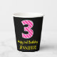 This cheerful birthday-themed square sticker design features a large number “3” with a light pink and dark pink stripes pattern, along with the message “Happy 3rd Birthday,”, and a personalised name. The background is coloured black. Paper cups like this might be used at a birthday party for somebody who is celebrating their 3rd birthday. [~Z0000580]