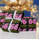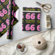 This fun birthday-themed wrapping paper design features a large number "66", with a dark pink and light pink stripes pattern. It also features the message "Happy 66th Birthday,", and a personalised name. The background is coloured black. Birthday themed wrapping paper like this might be a fun way to wrap a gift or present being given to celebrate somebody’s 66th birthday. [~Z0000376]