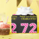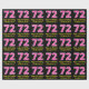 This fun birthday-themed wrapping paper design features a large number "72", with a light pink and dark pink stripes pattern. It also features the message "Happy 72nd Birthday,", and a personalised name. The background is coloured black. Wrapping paper like this might be used when giving a gift or present in honour of somebody’s seventy second birthday. [~Z0000376]