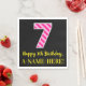 This fun birthday-themed paper napkin design features a large number "7", with a light pink and dark pink stripes pattern. It also features the message "Happy 7th Birthday,", and a customisable name. The background is coloured black. Birthday themed paper napkins like this might be used when celebrating somebody’s 7th birthday. [~Z0000380]
