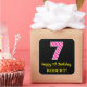 This joyful birthday-themed square sticker design features a large number “7” with a light pink and dark pink stripes pattern, along with the message “Happy 7th Birthday,”, and an editable name. The background is coloured black. Fun, personalised stickers like this might be given as a birthday present, or used while wrapping presents, or perhaps used as a birthday party decoration when celebrating somebody’s seventh birthday. [~Z0000578]