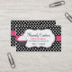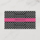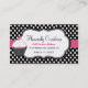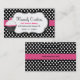 Pretty bakery business card done in a black and white polka dot background, with a pink bold band, across the middle, and a decorative black edged white text area, on the front. Whimsical graphics of pink, white, and black cupcake decorates the left side, of the card. Text is fully customisable to suit your business needs. Great for at home bakers too.