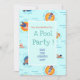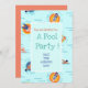 A modern fun party invitation for a pool party featuring a retro hip, cool graphic of swimmers and pool toys in bright and vibrant colours of orange and blue. The text on this invitation is fully customisable to include your own personal details.