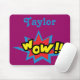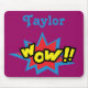 A fun pop art mousepad this item features "Wow" written in yellow street graffiti text. With a red and blue star behind it, your name is written in lovely blue font at the top. The background is purple. Order yours today!