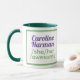Funny pronouns slogan on a two-tone coffee mug says persons name and then "She, Her, Awesome".