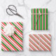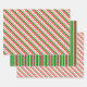 These festive Christmas style designs feature green, white, and red coloured striped patterns. Wrapping paper sheets like these might be fun to use when preparing gifts being given to celebrate Christmas.