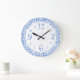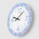 Fun retro pattern clock in crisp elegant blue and white big playful numbers.