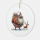 Fun Santa with a cute reindeer and his bag of gifts on a ceramic Christmas ornament. Text on back can be changed. Watercolor illustration with AI assisted graphic purchased with commercial use. Artwork: RedHeronLighthouse