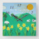 The original and cute sheep illustration on this original and fun cclock is a painting in a "nieve" sort of style, it's bright and colourful. The picture shows some white and fluffy black faced sheep grazing behind daffodils on the hillside as the large sun shines down upon them. In the background you can see small leaf covered trees with red apples on them. This unique clock has the fun slogan "May the sun always shine on Ewe!" and is suitable for people of all ages.