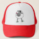 A fun Red and White Trucker Hat, with a comic sheep holding a bright red flower in its mouth, from a hand-drawn illustration by Judy Adamson