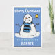 Fun snowman cartoon on a festive Christmas card. Christmas card for a Barber.