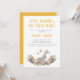 A cute baby shower invitation perfect for spring. The top features the phrase "some bunny's on their way!", and the bottom of the invitation has a beautiful illustration of a bough of wild flowers, with a rabbit sat in the middle, and flying bees. The reverse side has a block mustard yellow backing.