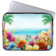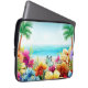This laptop sleeve has a fun design for summer featuring a beach scene with flowers, butterflies, palm trees and the beach and ocean in the background.