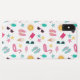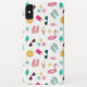 Fun summery iPhone case featuring a pattern of pool and summer themed objects. Pink flamingo swim rings. Striped flip flops. Ice creams and ice pops. Sunglasses. Suns, starfish, and more.