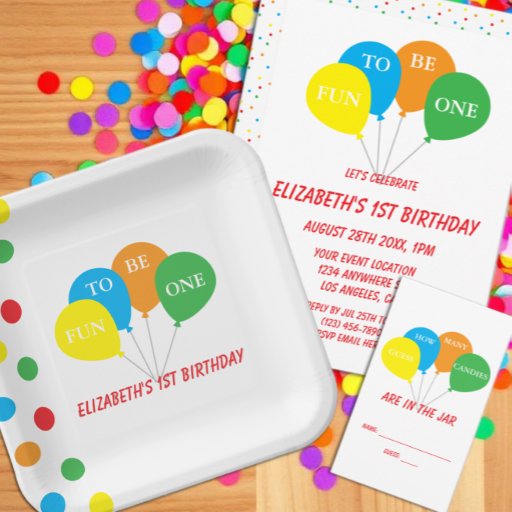 So much fun to be one! Colourful 1st birthday collection with balloons and confetti dots.