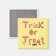 These fun Halloween magnets feature the words, Trick or Treat. The words include a broom, witch legs, candy designs, and a pumpkin. They are light orange outlined with a red orange. The letter k is made of a broom and witch legs. A display of candy is pictured below the words. The background colour is yellow and it can be customised to any colour of your selection. Thank you for shopping CherylsArt on Zazzle.